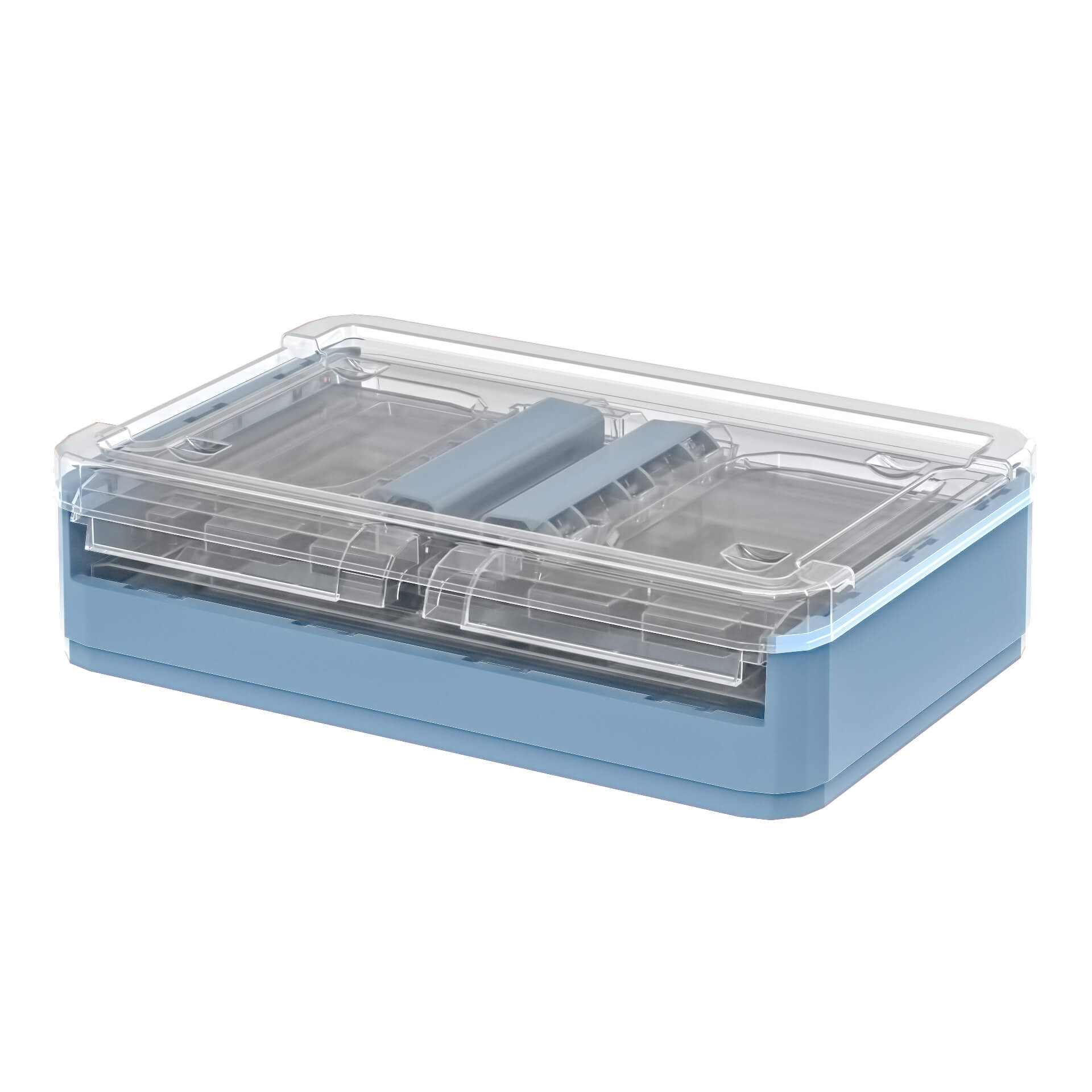 Складной пластиковый ящик 360х235х230 мм, прозрачный с синим дном, колесиками и дверцей – удобство и функциональность в одном решении