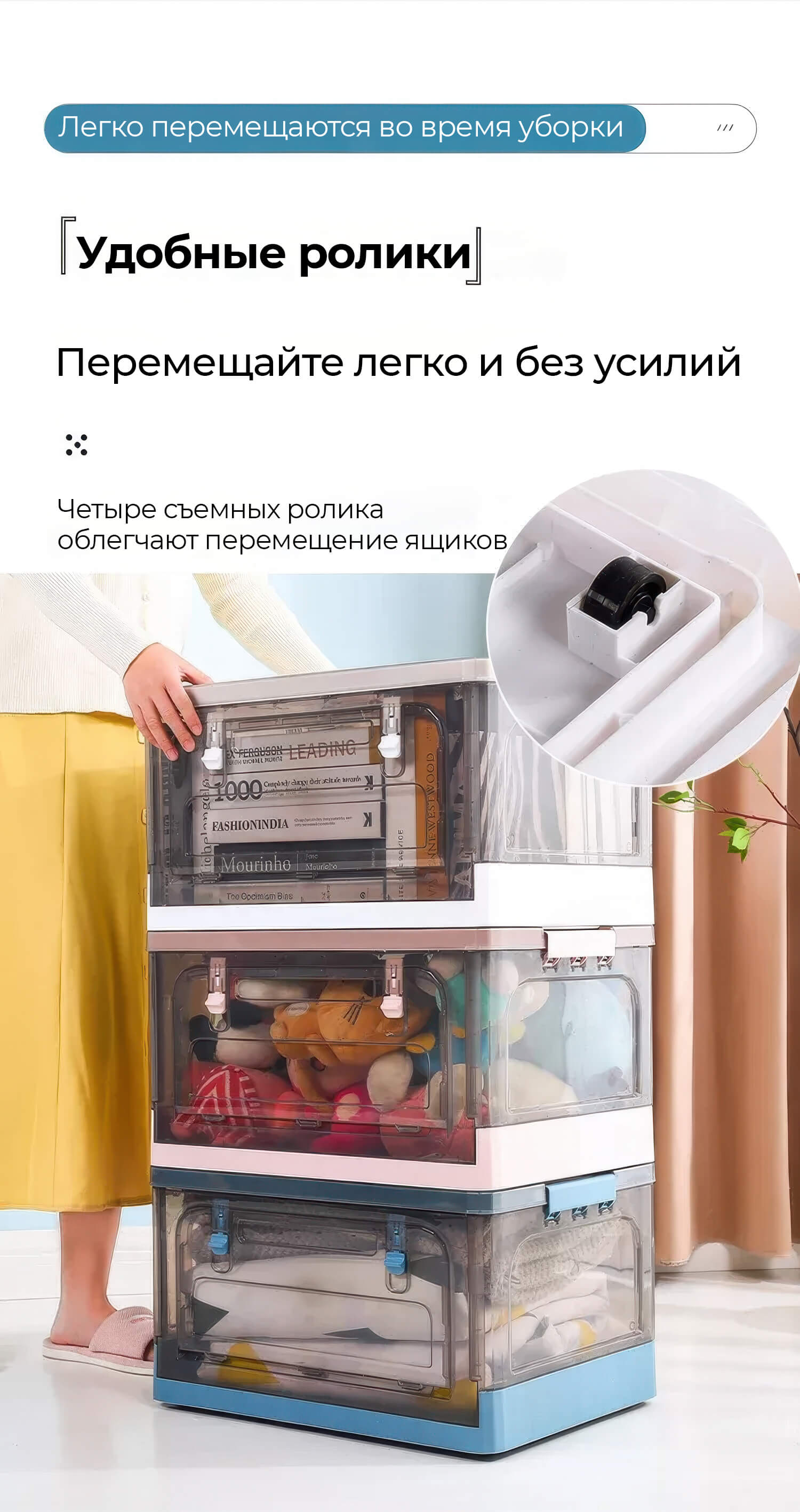 Пластиковая коробка с крышкой защищает вещи от пыли и влаги, а прочная конструкция обеспечивает долговечность даже при активном использовании. Колесики делают перемещение легким и удобным, а встроенная дверца на боковой стенке позволяет быстро получить доступ к содержимому, не снимая крышку. Складная конструкция экономит пространство, когда контейнер не используется.