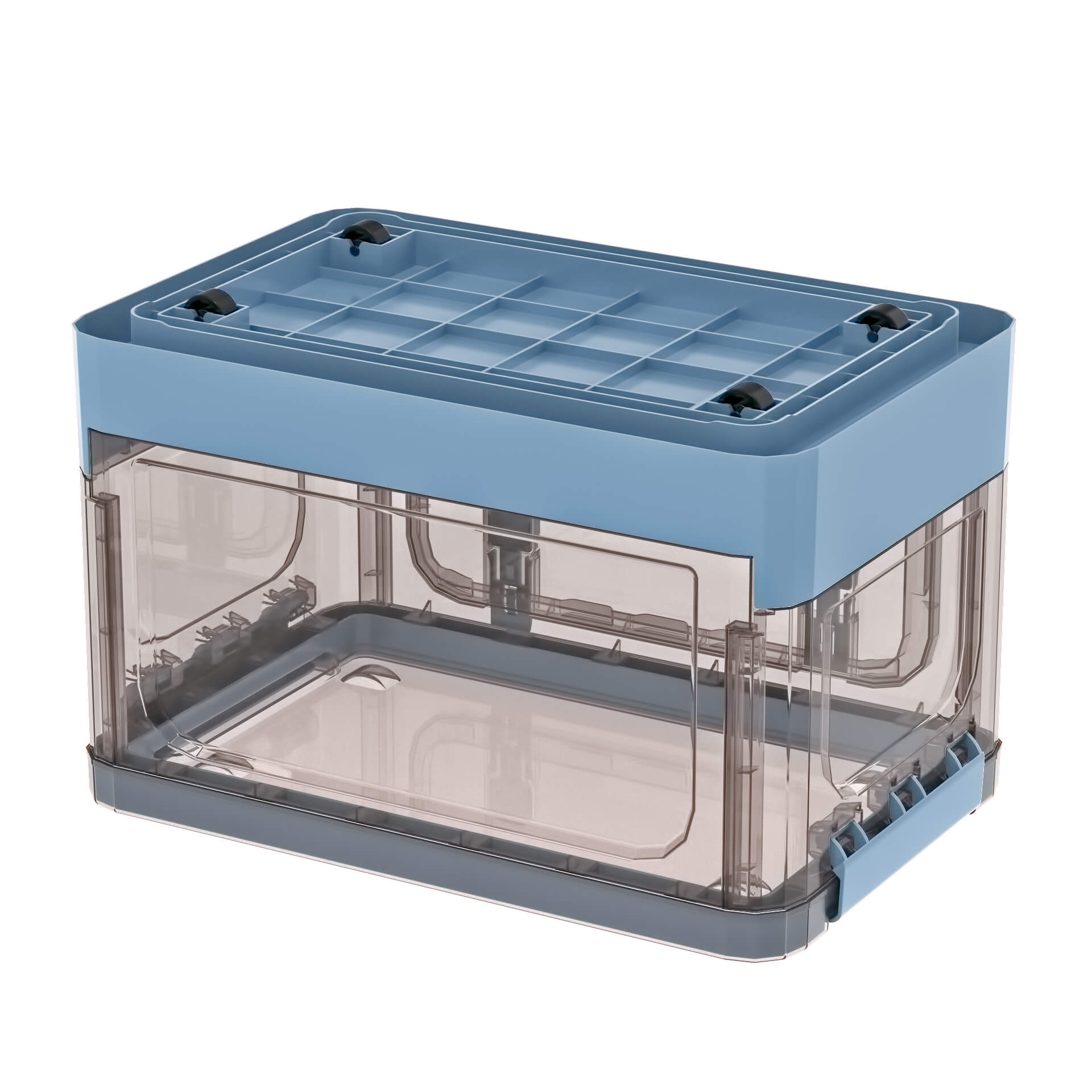 Складной пластиковый ящик 360х235х230 мм, прозрачные стенки с коричневым оттенком, с синем дном, с колесиками – надежное и стильное решение для хранения