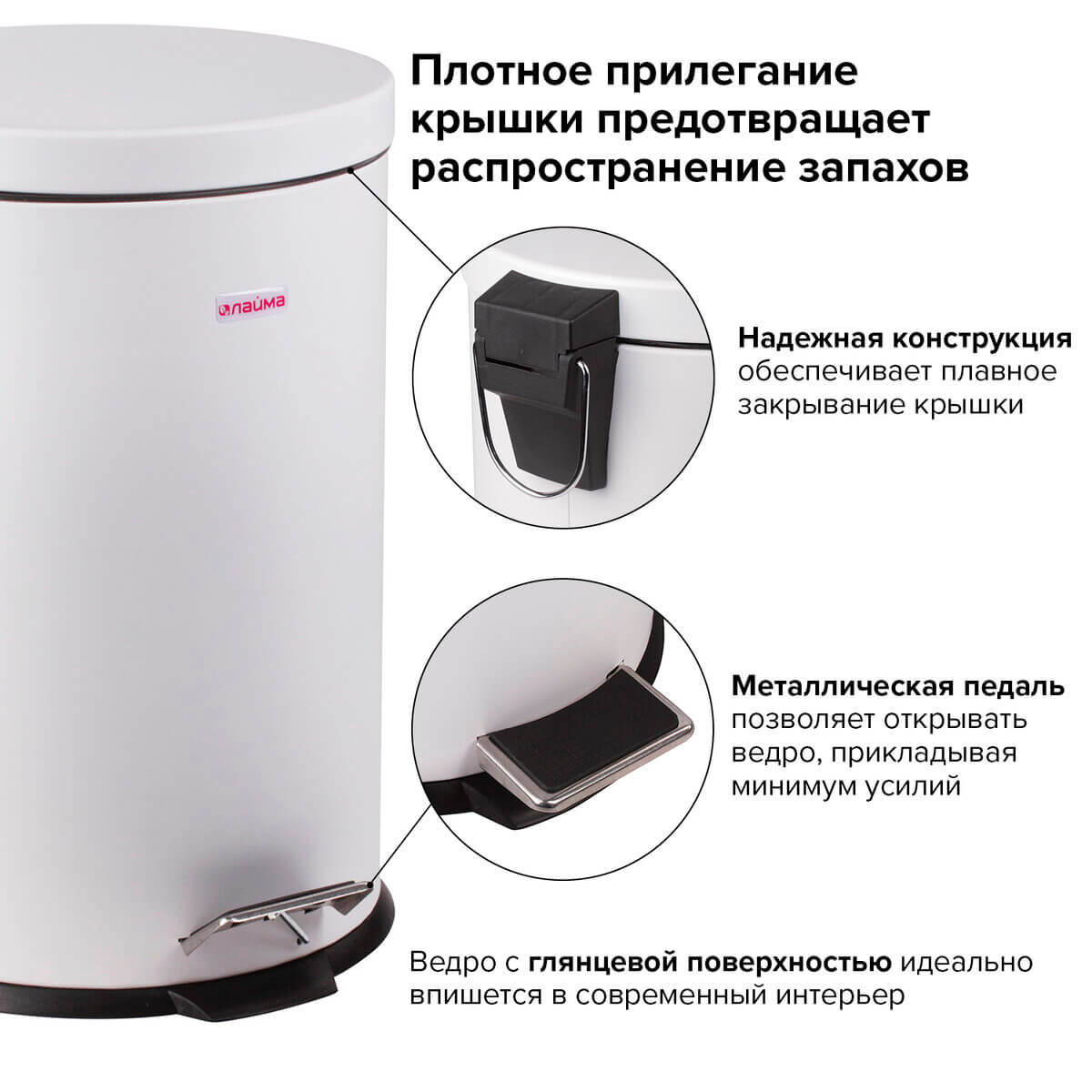 Ведро-контейнер для мусора (урна) с педалью LAIMA Classic, 12 л, белое, глянцевое, металл, со съемным внутренним ведром