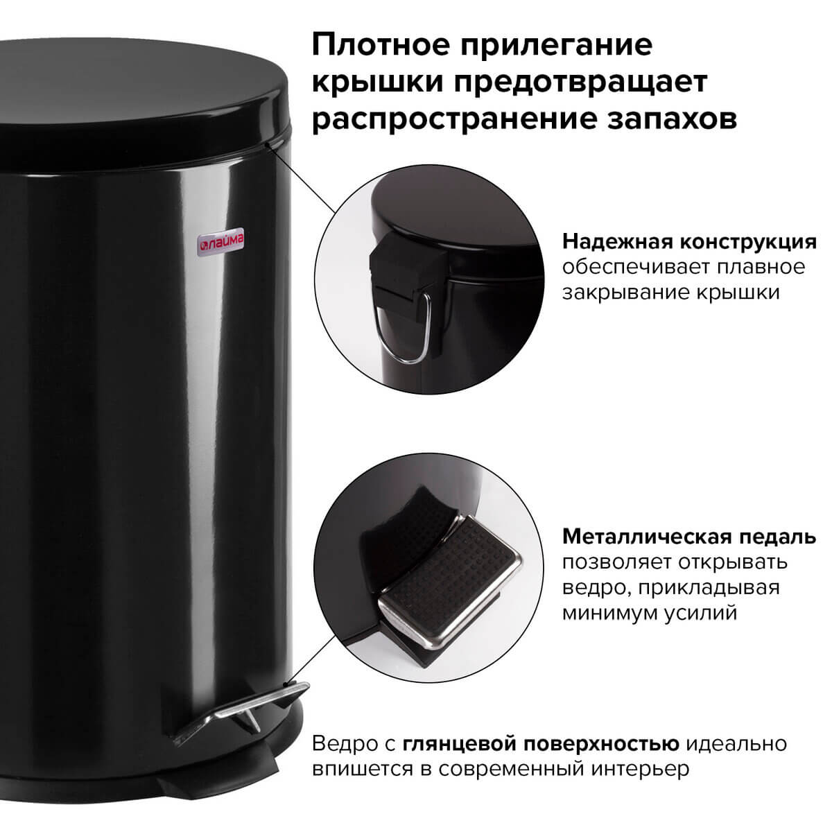 Ведро-контейнер для мусора (урна) с педалью LAIMA Classic, 20 л, черное, глянцевое, металл, со съемным внутренним ведром